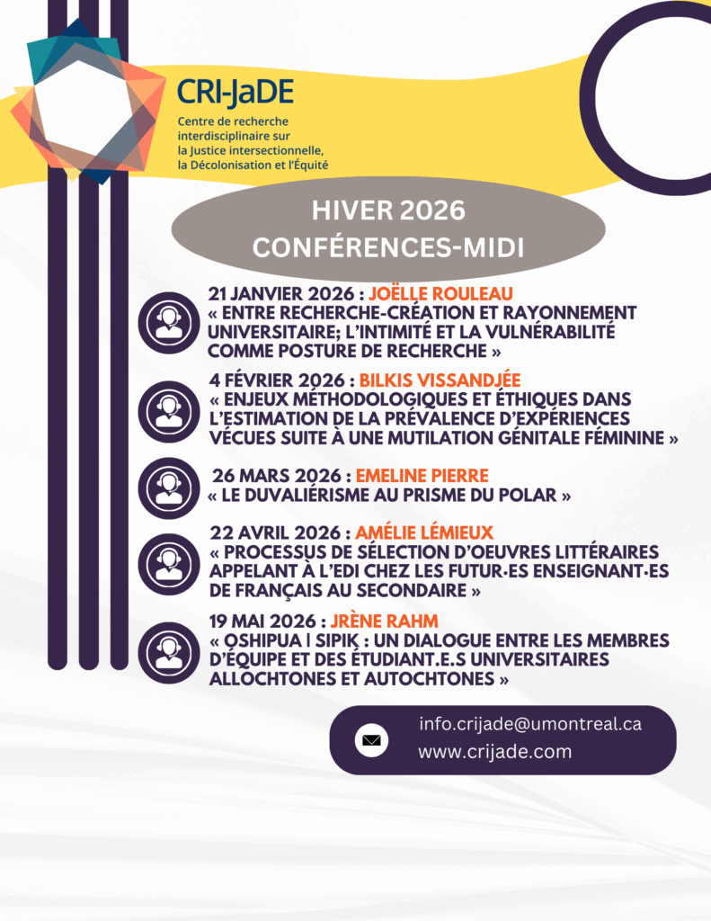 Sur le temps de la pause dîner, le CRI-JaDE propose de 12h à 13h des présentations en ligne de nos membres suivi d’une période d’échange. Au menu, des thématiques autour de l’intersectionnalité, de l’Équité la Diversité et l’Inclusion (EDI) et de la justice sociale ! Les conférences seront enregistrées pour rediffusion sur notre chaîne YouTube.