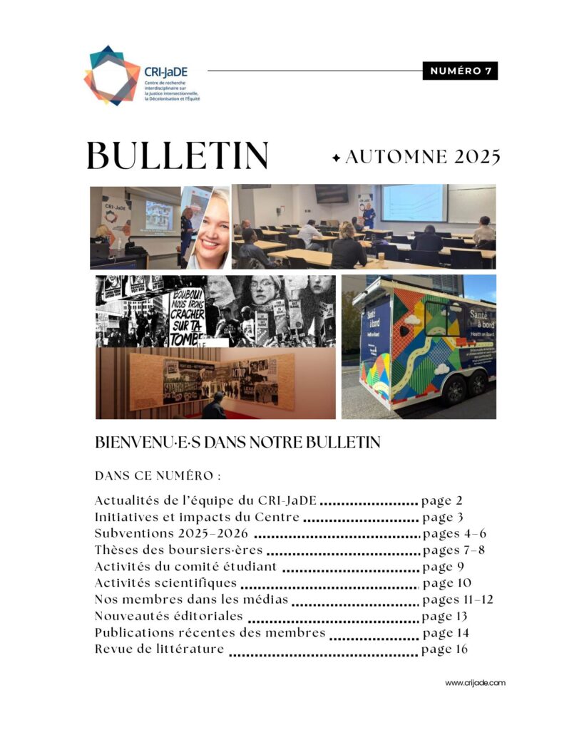 Le bulletin numéro 7 du CRI-JaDE présente les activités du centre pour la rentrée 2025-2026. Plusieurs changements dans l’équipe de direction sont advenus, mais les activités ont continué, avec beaucoup d’initiatives. Le CRI-JaDE a d’ailleurs été une contribution importante pour la nomination de l’Université de Montréal comme un des meilleurs employeurs du pays en 2025. Parmi les initiatives que nous présentons, une recherche d’une équipe du CRI-JaDE, guidée par Geneviève Mercille nous parle de l’insécurité alimentaire chez les jeunes au Québec. Plusieurs projets de recherche et bourses étudiantes sont également présentées dans ce numéro de notre infolettre. Les étudiant·e·s sont au centre de ce numéro, en raison de leurs activités très nombreuses en 2025, qui se poursuivent en 2026. Si 2025 a été une année dans laquelle les membres du Centre se sont mis·es en lumière, 2026 sera aussi une année riche pour la programmation des conférences-midi. Poursuivant la tradition, nous présentons les apparitions de nos membres dans les médias, leurs publications scientifiques ainsi qu’une revue de littérature des publications sur l’EDI, la décolonisation et l’intersectionnalité parues en 2025.
